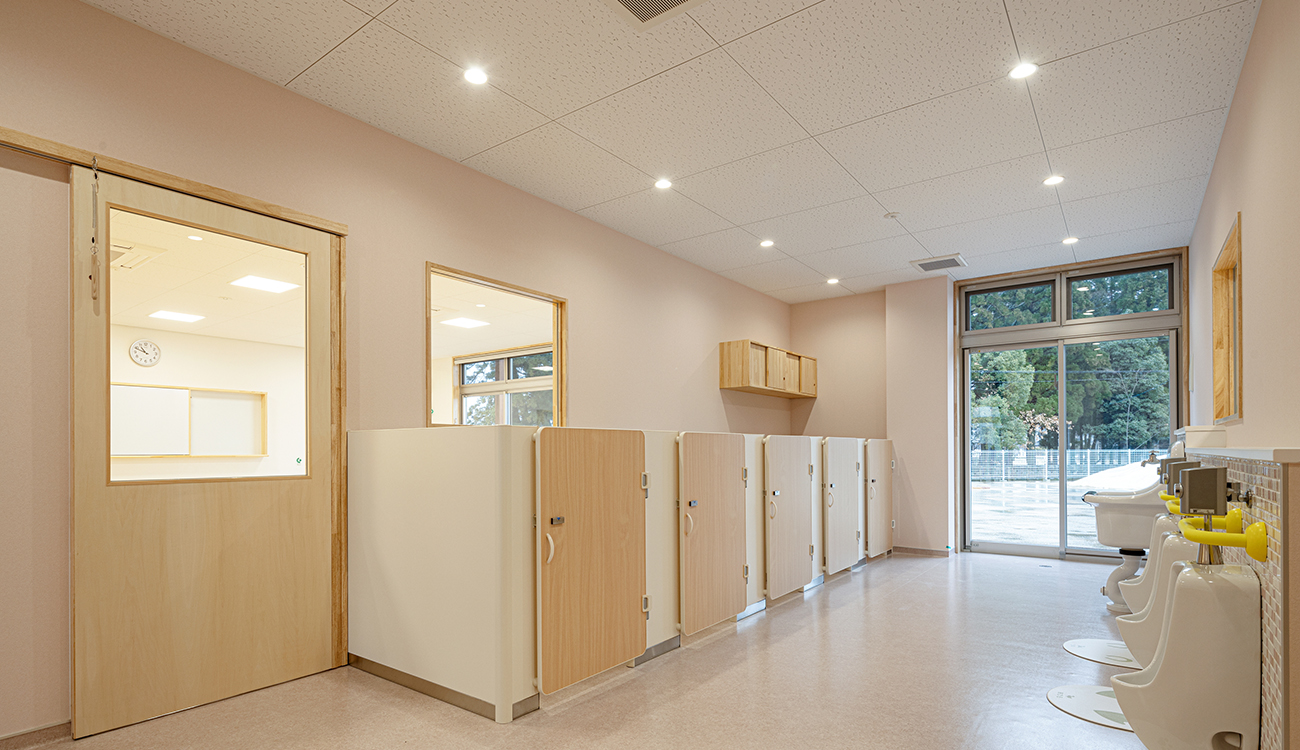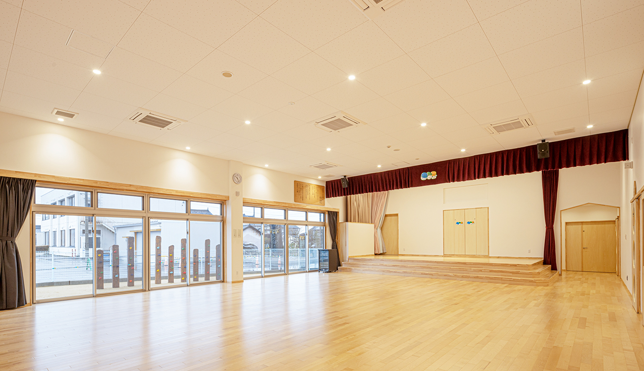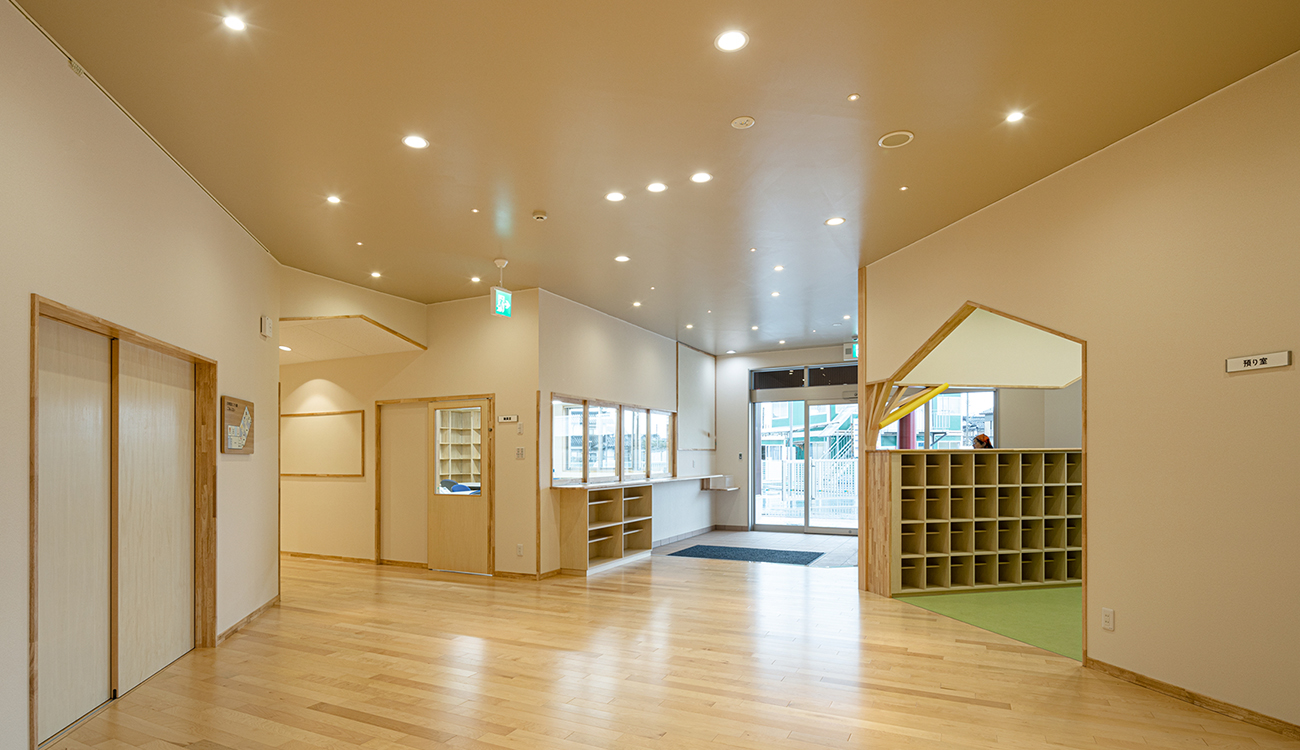 建物形状をくの字とし、園庭を囲む様に保育室をレイアウトしました。限られた面積の中で使い勝手を考慮し、シンプルな間取りとしつつも様々なアイデアを盛り込みました。玄関ホールの照明はランダムに配置し、星座の形を盛り込むことで、天井を見上げると発見があったり、会話を生み出す仕掛けとしました。基本動線は南北に一本通す形とし、機能面の向上を図ると伴に、視線が通る様にしました。全体として勾配天井の廊下や明るい下足コーナー等、楽しい雰囲気を意識した作りとしています。