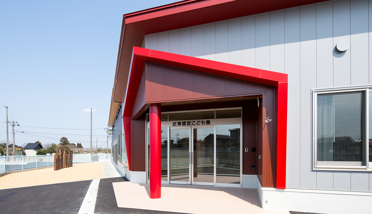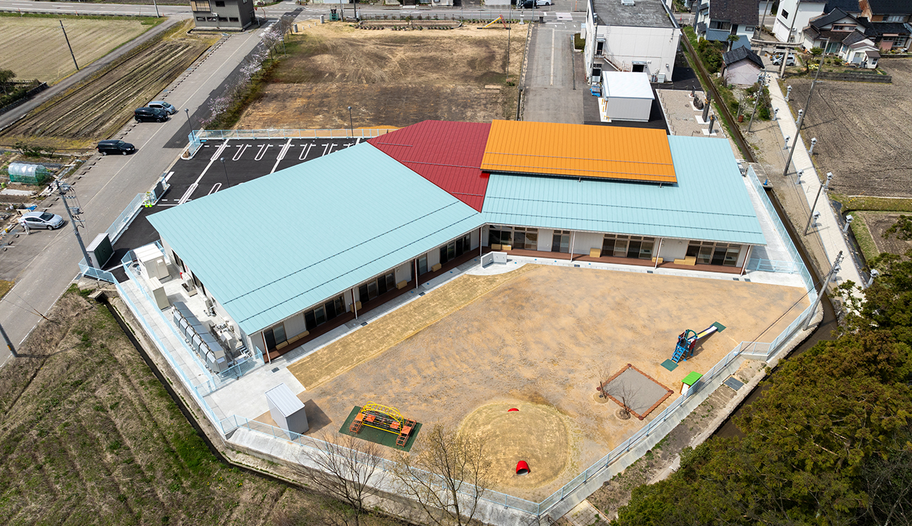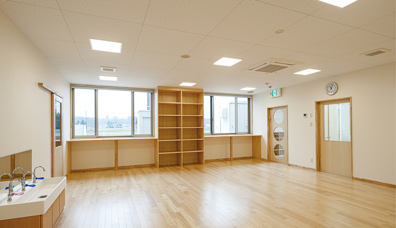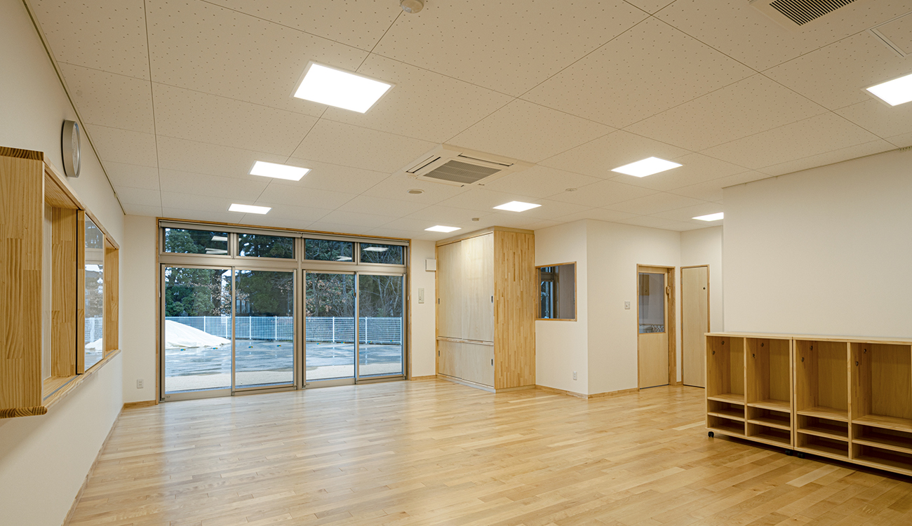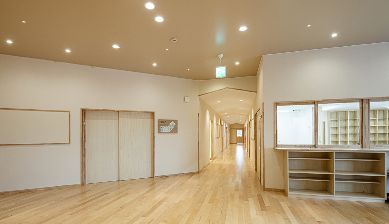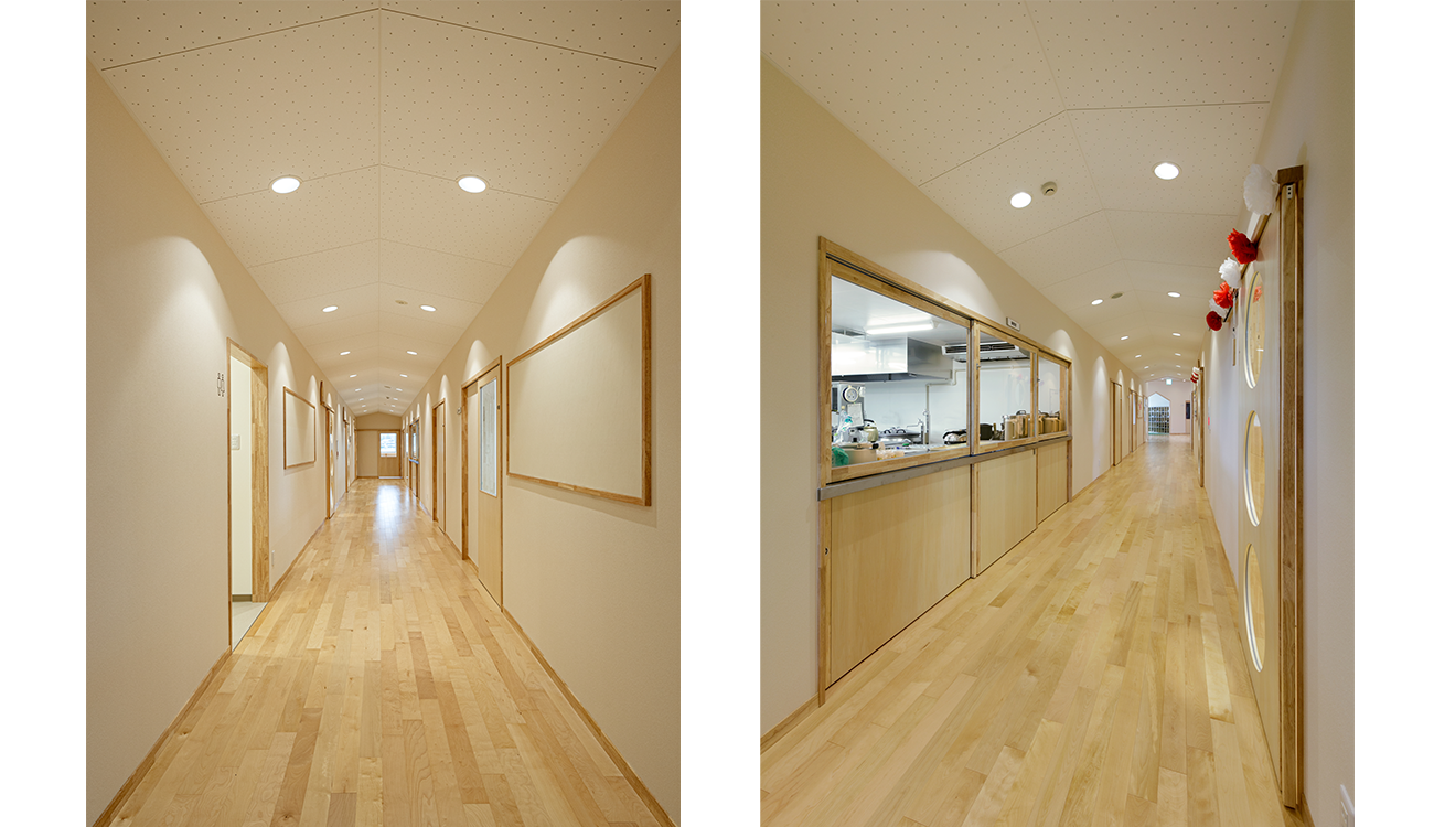 建物形状をくの字とし、園庭を囲む様に保育室をレイアウトしました。限られた面積の中で使い勝手を考慮し、シンプルな間取りとしつつも様々なアイデアを盛り込みました。玄関ホールの照明はランダムに配置し、星座の形を盛り込むことで、天井を見上げると発見があったり、会話を生み出す仕掛けとしました。基本動線は南北に一本通す形とし、機能面の向上を図ると伴に、視線が通る様にしました。全体として勾配天井の廊下や明るい下足コーナー等、楽しい雰囲気を意識した作りとしています。