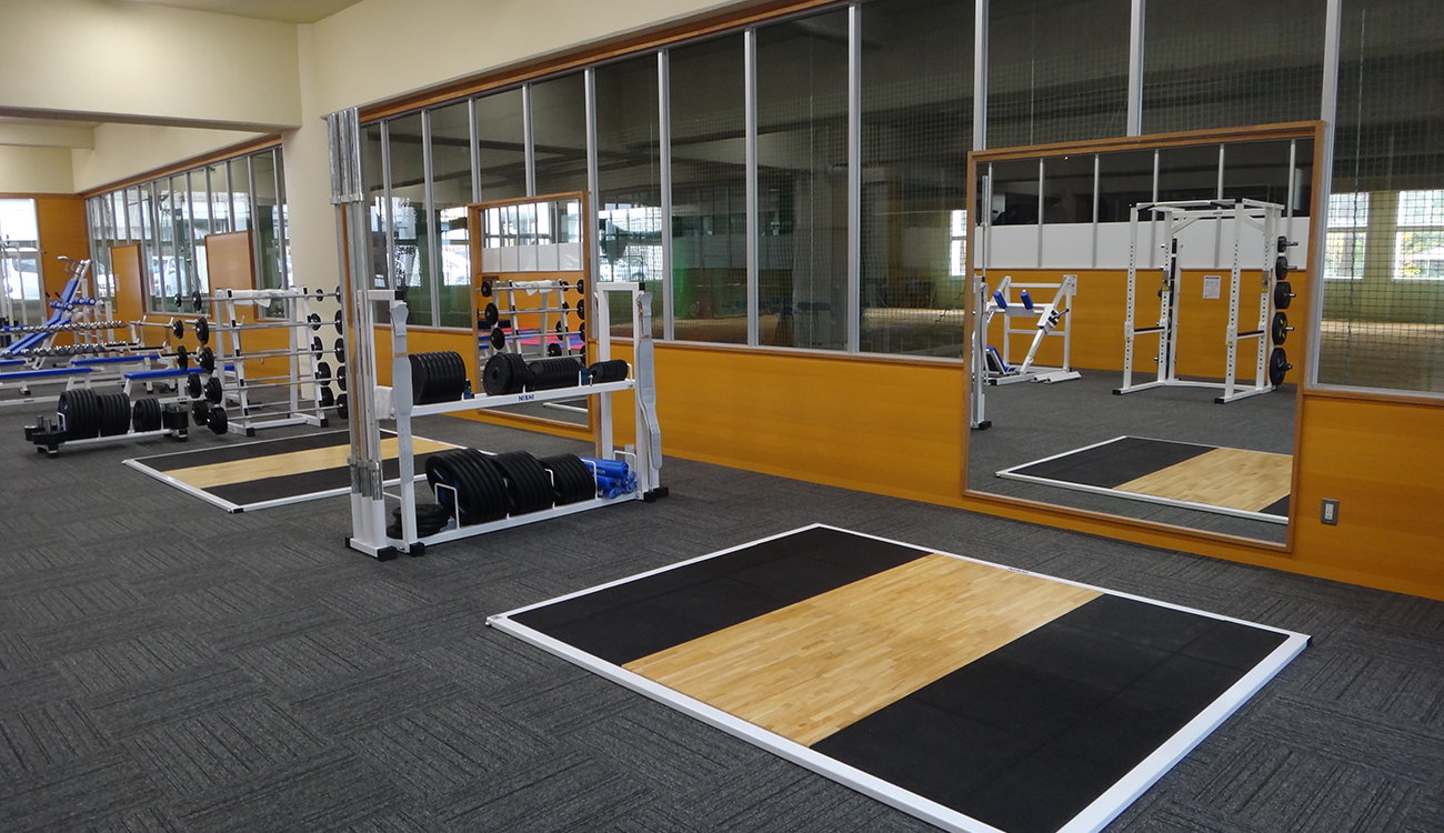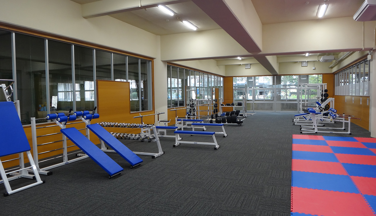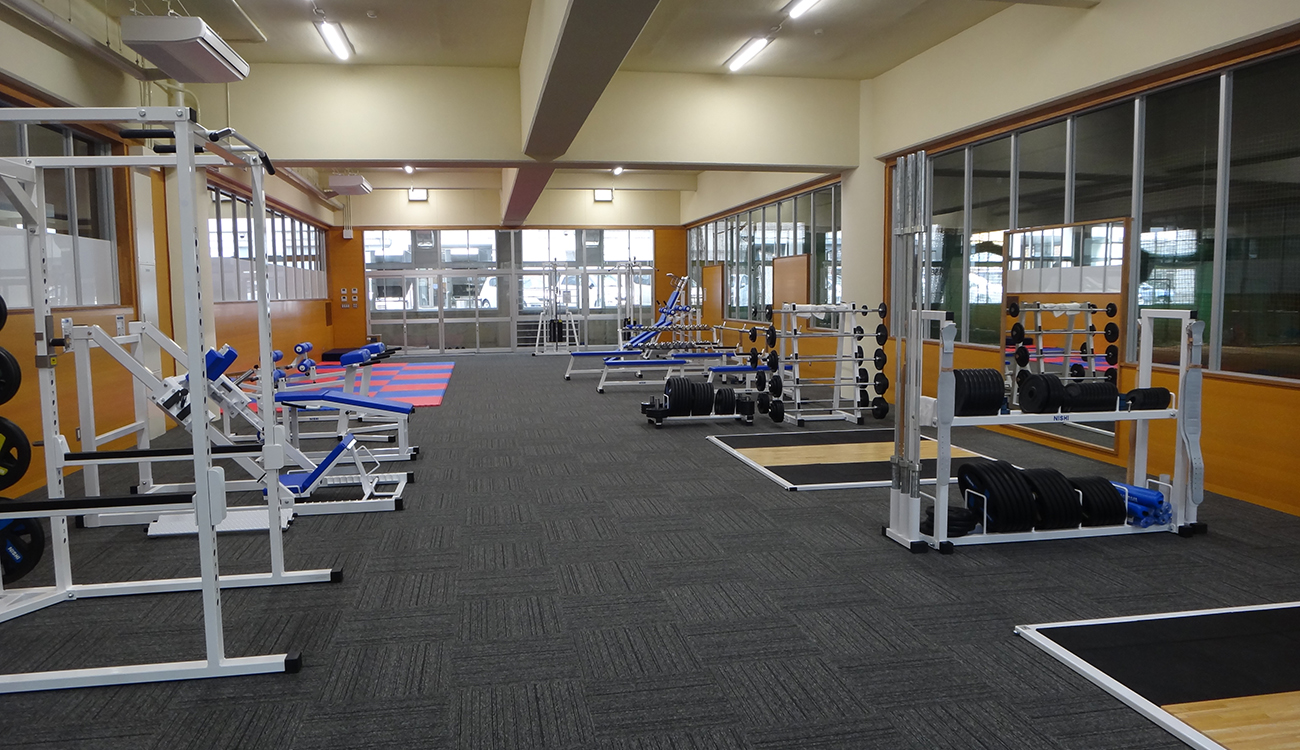 高校体育館1階ピロティに新しくトレーニング室を設けました。 ピロティ奥部に雨天練習場があるため、管理通路からの見通しを 最大限確保しシンプルな構成としています。 ガラスは全て強化ガラスを使用し安全にも配慮しました。 トレーニング機器も充実し、生徒の基礎体力向上につながれば幸いです。