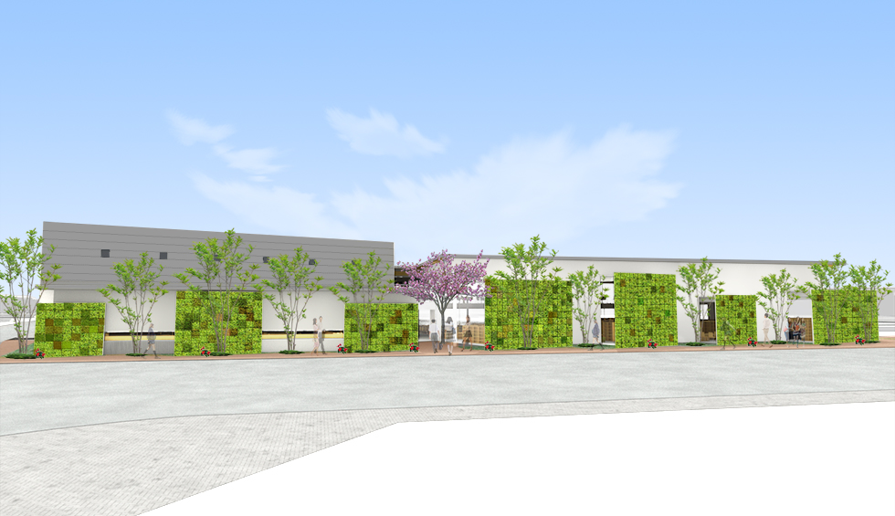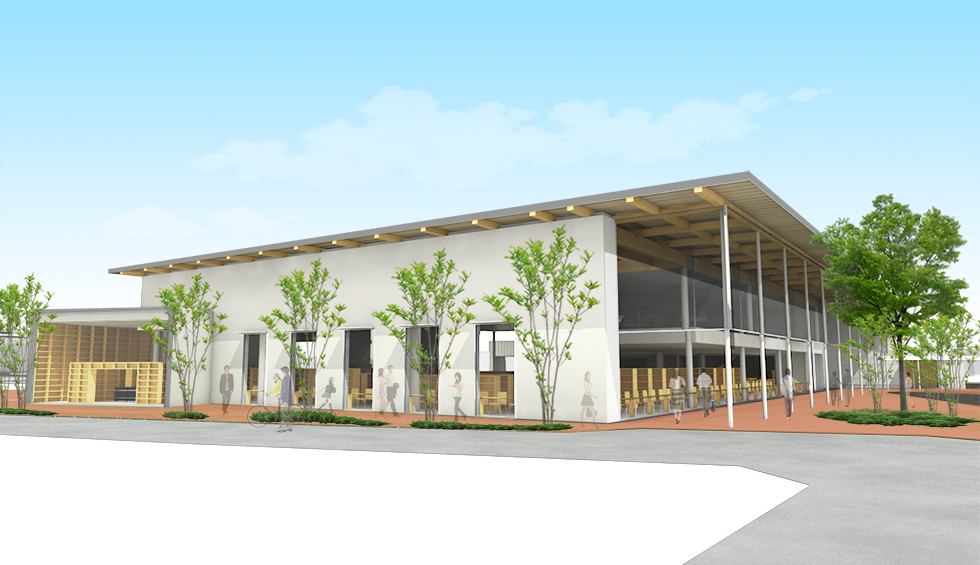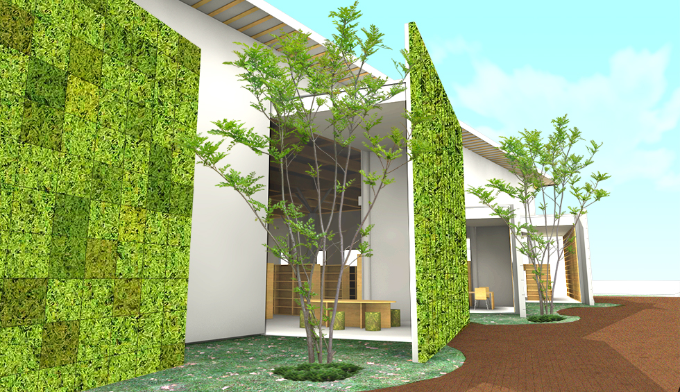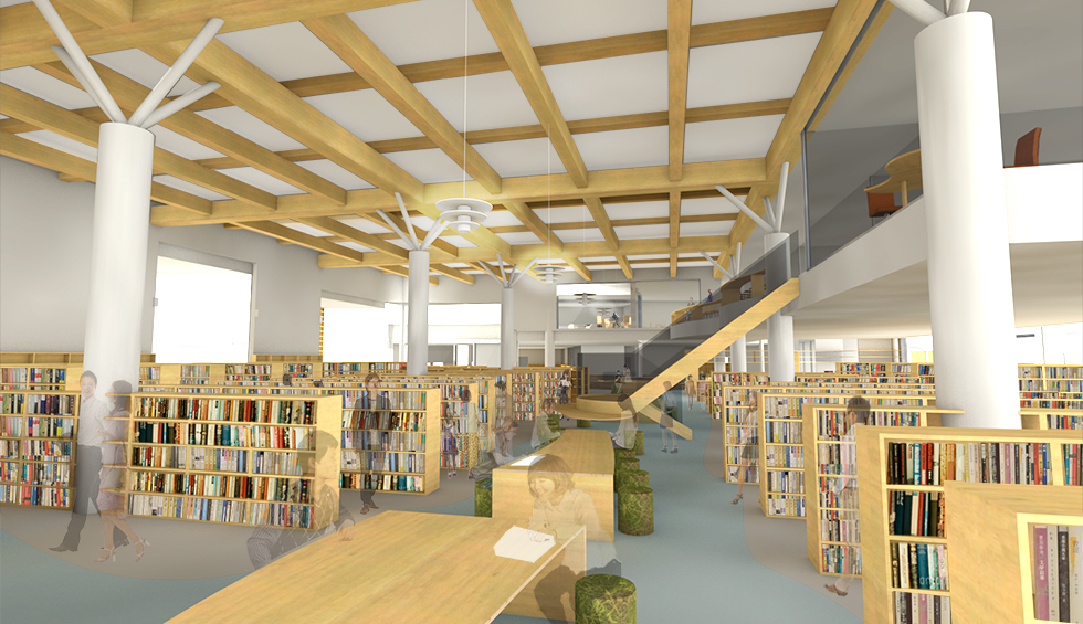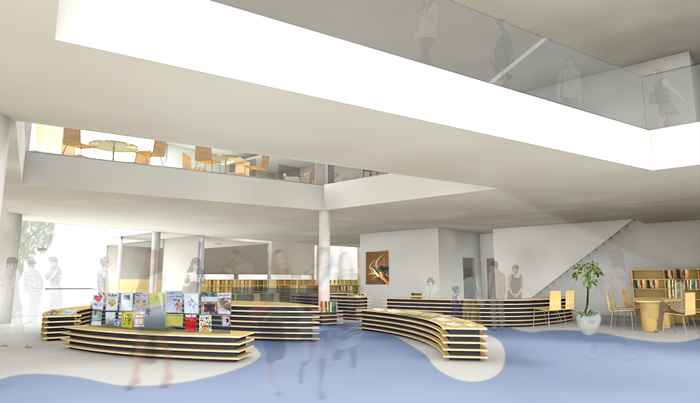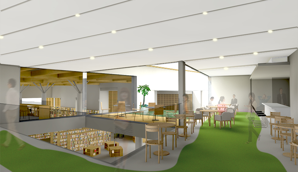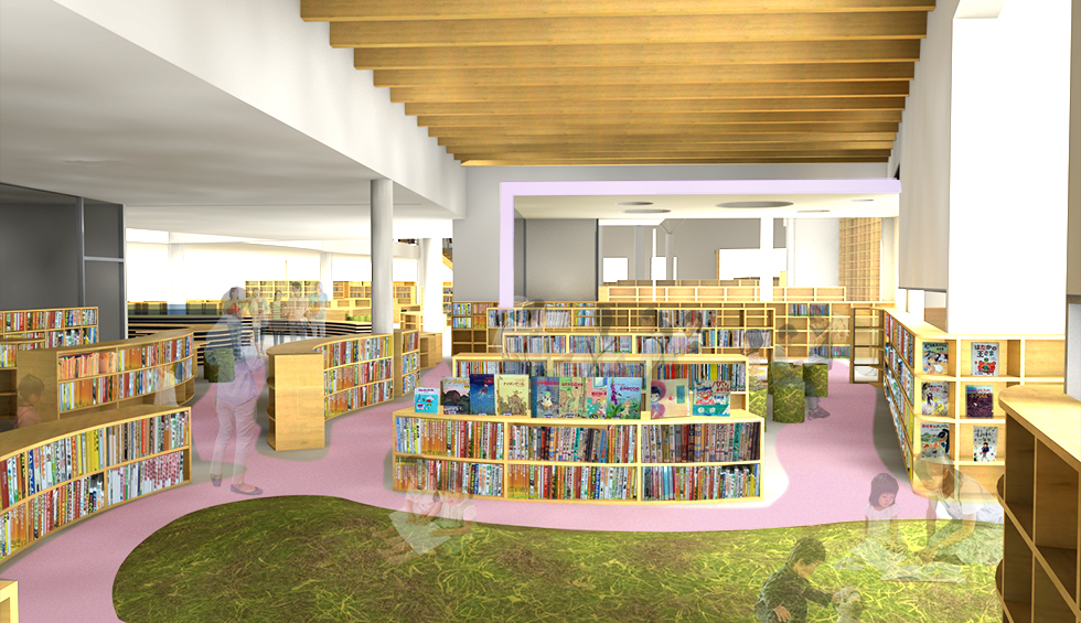 「出会い」「世代」「記憶」をつなげるをコンセプトに地域に開かれた図書館を計画。 機能的な動線や分かり易いゾーニングはもちろんのことですが、視線や日照、道路との緩衝空間を意識しました。西側道路に面してグリーンウォールを配置し西日対策とすると伴に、壁に角度を設けることで視線をコントロールし、室内から緑が目に付く様にしています。また地域にある特徴をデザインソースとして内外観に取り入れ、親しみが持ち易い施設としています。外部から施設内へ入ると、まず中央に企画・展示コーナーがあり最新の情報に触れることができ、そこから各目的のコーナーに分散していくという分かり易い館内レイアウトとしています。