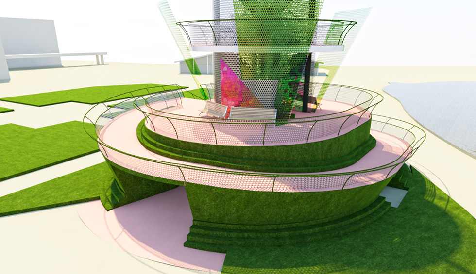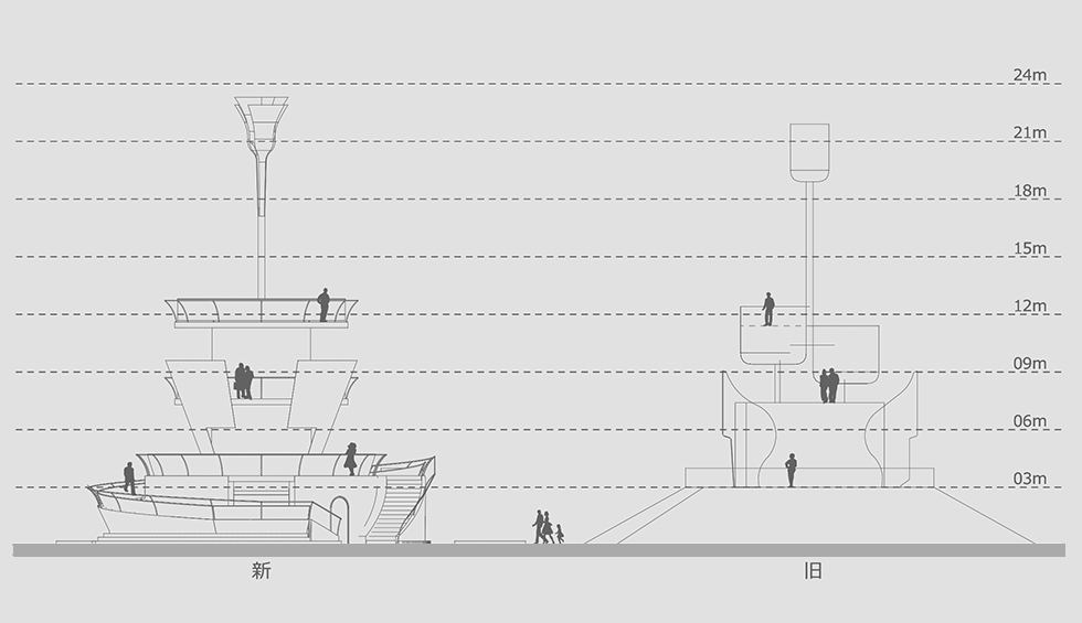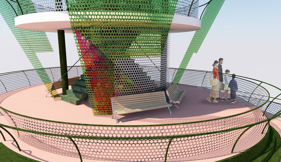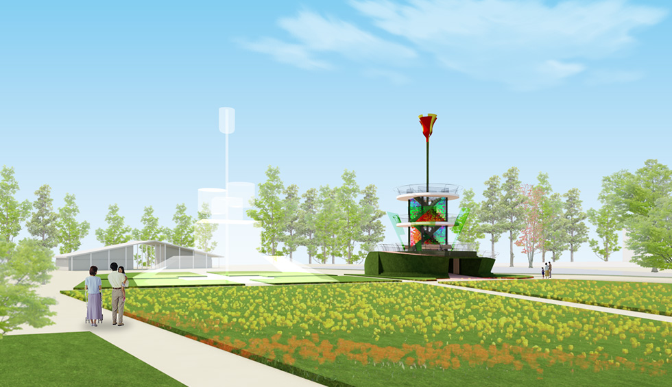 新たなシンボルタワーの提案。花壇・人・歴史を「つなぐ」をキーワードに庭園の通路動線をスロープによってタワーへと導き、人の集まりが生まれ、旧タワーのデザインも残しつつシンボル性を強調した円形の案としました。タワーのトップにある花びらは、花の公園ということもあり、リアルな花の形状ではなく、識別できる程度にシンプル化したものとし、葉に見立てた階段・手すりそして、根本には球根にみたてたドームを設けています。 スロープは展望台まで、周りながら移動することで変わりゆく景観を楽しみながら、高さ3.6mの第1展望台までを1/15勾配で登れるように計画しています。またスロープの登り始めはトンネルとなっており、トンネル内は展示スペースとして利用し、光を利用するなど好奇心をくすぐる演出としています。