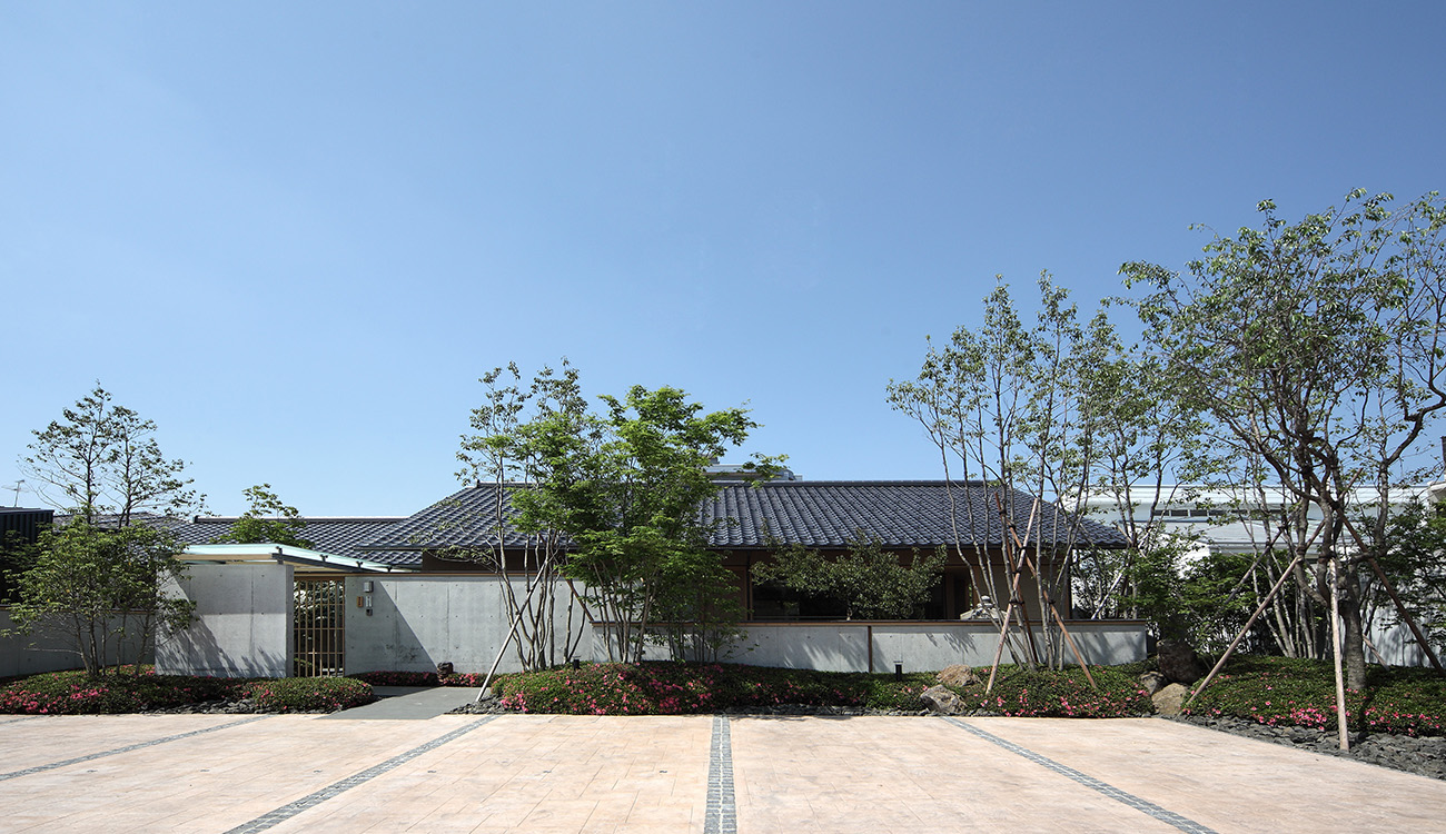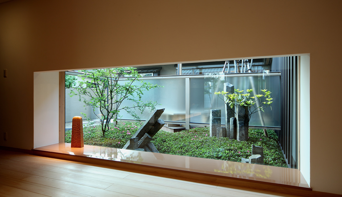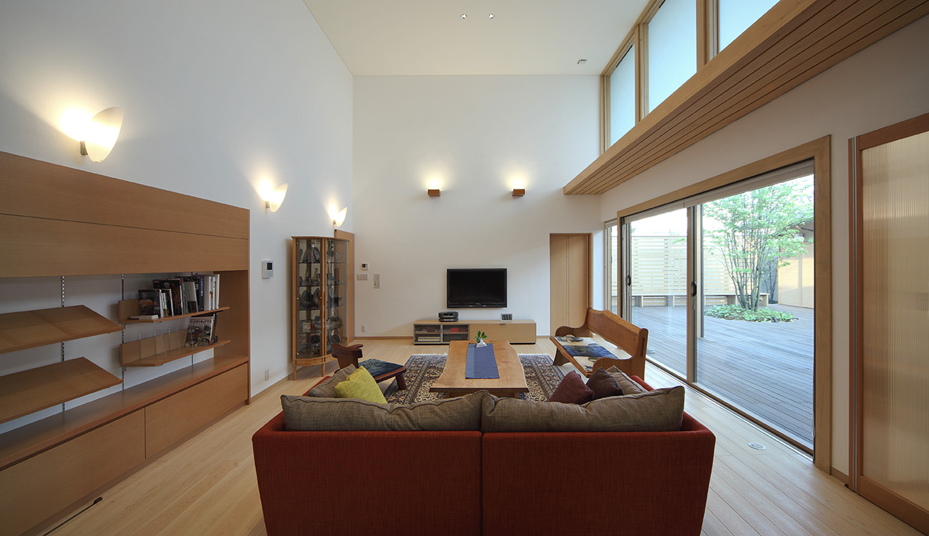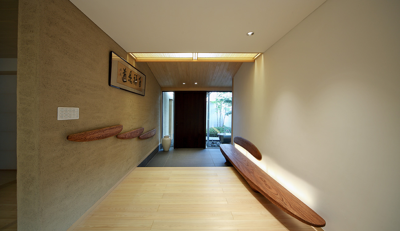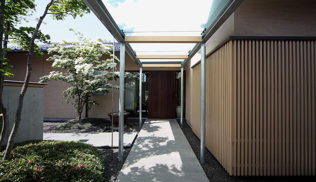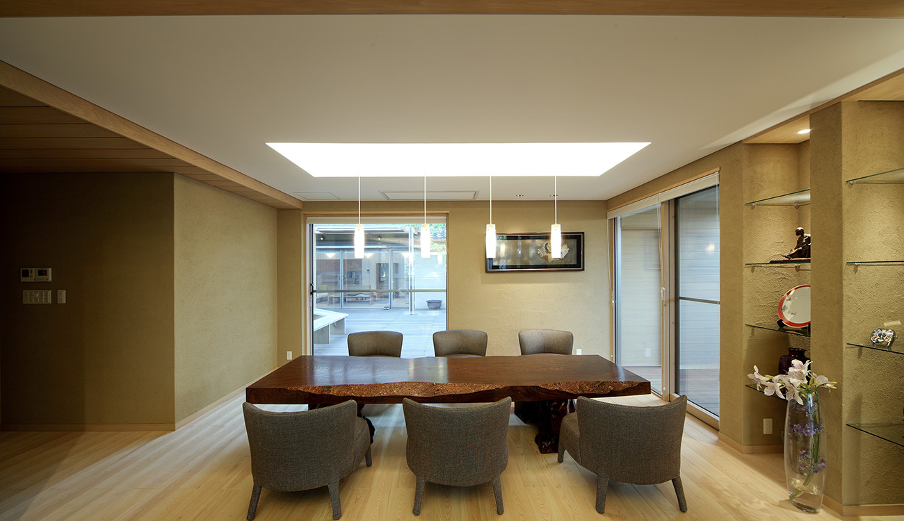 「ゲスト棟」と「家族棟」の2棟に分け、それらをつなぐ渡り廊下と、内部空間とのつながりを持たせた大きな外部テラスで構成した住宅。 分棟形式でありながら、内外との一体感をつくり全体としてまとまった空間としています。 渡り廊下は、絵画・骨董品等美術プロジェクトを飾るギャラリーとして利用し、アーティスティックな空間演出としています。 玄関に設けた雲のようなベンチ・背もたれ、そして手摺は地元の彫刻家とのコラボレーションによるものです。