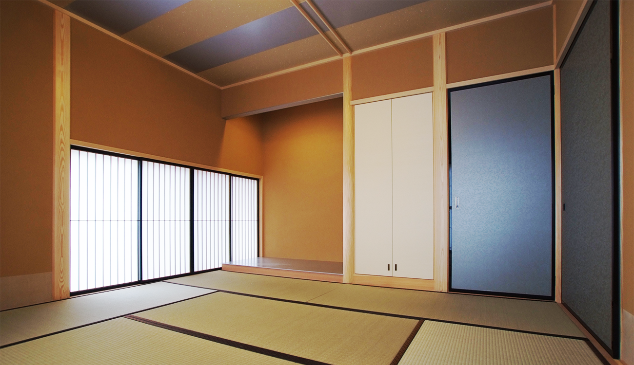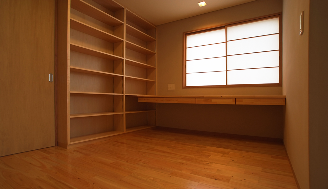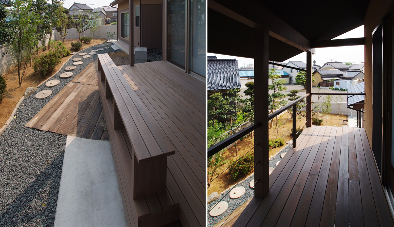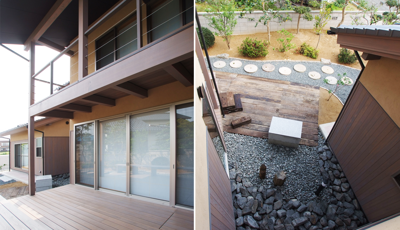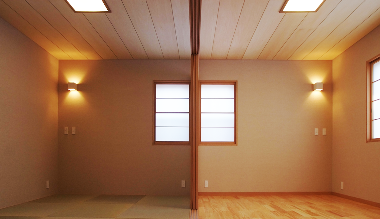 1階はリビングに面してテラスを設け内部の延長として機能させ、2階には個室に面してバルコニーを設けることで、横方向・縦方向の2軸の繋がりのある、外部を活かした豊かな空間構成としています。また内部は障子を多く利用し、視線を遮りつつ緩やかに光を取り入れ、柔らかく温かい空間としています。また、障子により部屋を区画できるようにすることで、用途に合わせて大きさを変えられ柔軟性のある間取りとしています。
