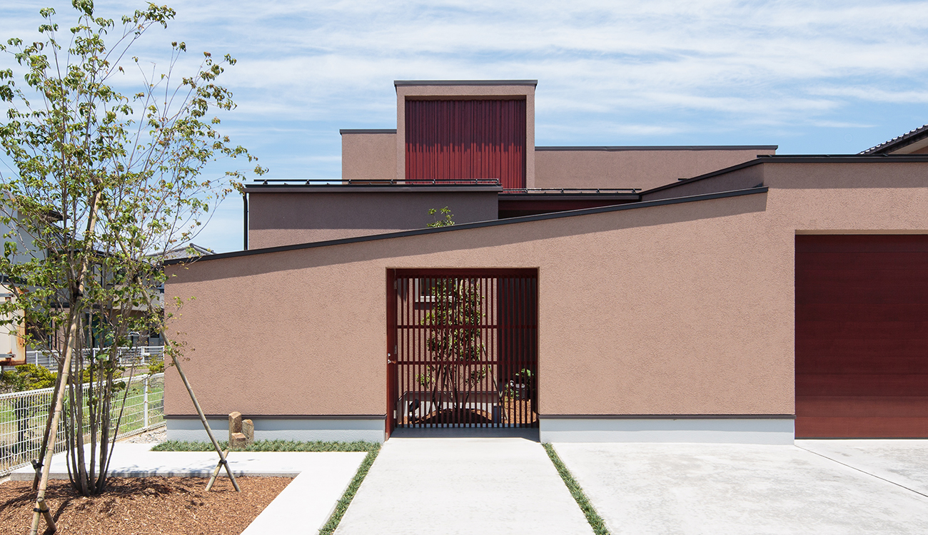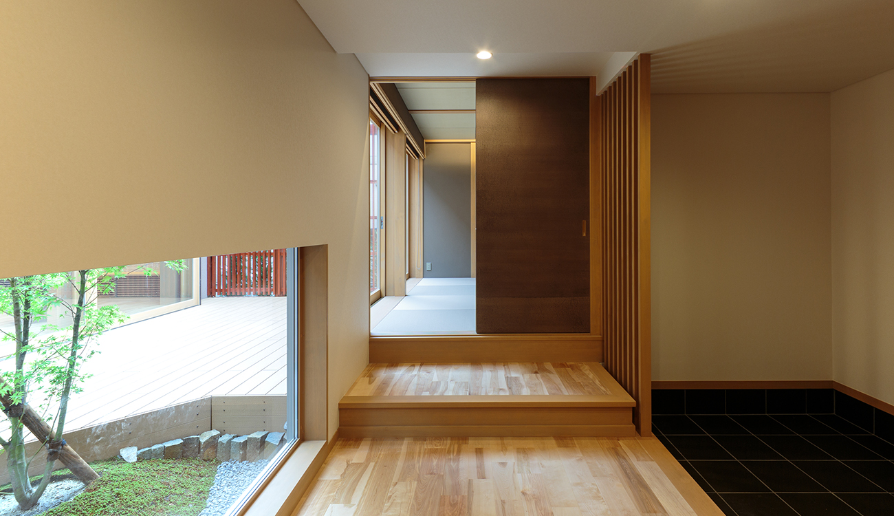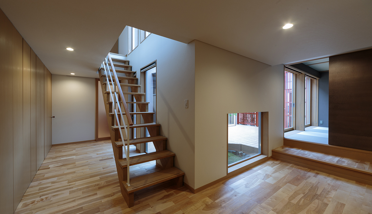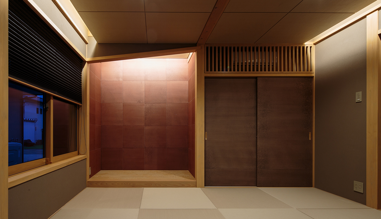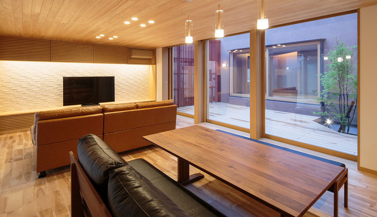 20帖の大きなワクノウチを移設し、居間として利用した住宅。木材の重厚さを感じつつも、シンプルな納まりとすることにより、 主張しすぎず落ち着いたデザインとしています。木以外には、コンクリートや漆喰・珪藻土といった自然素材を使い共に引き立て合う仕様としています。 ワクノウチでは居間としての機能の他、来客時の客間や施主の趣味である音楽ライブといったイベントにも利用でき、多様性のある空間となっています。 お風呂にもこだわりがあり、浴槽には桧を使い、木のスクリーンで囲んだ小庭には陶器の露天風呂も設けてあります。