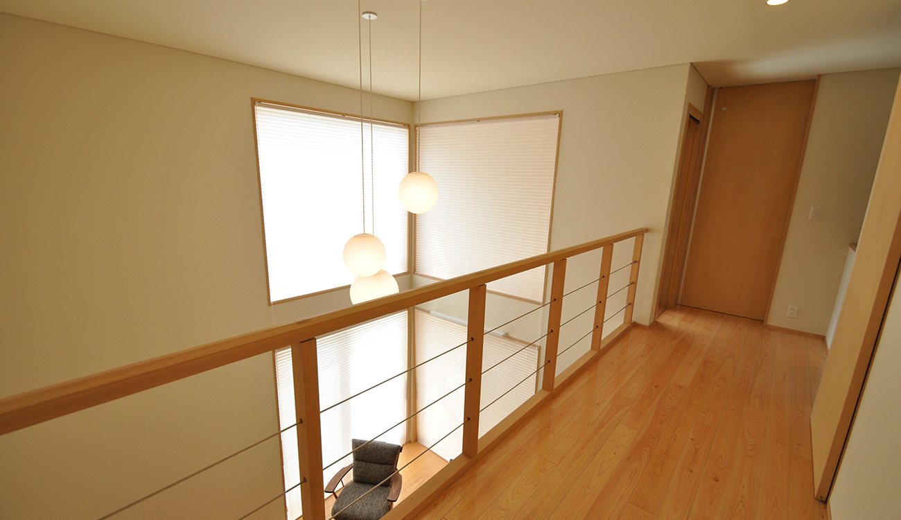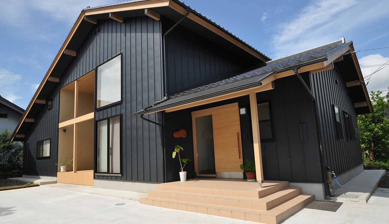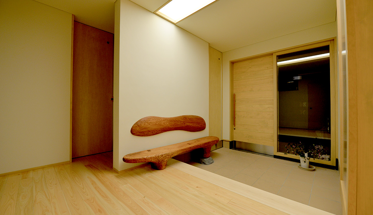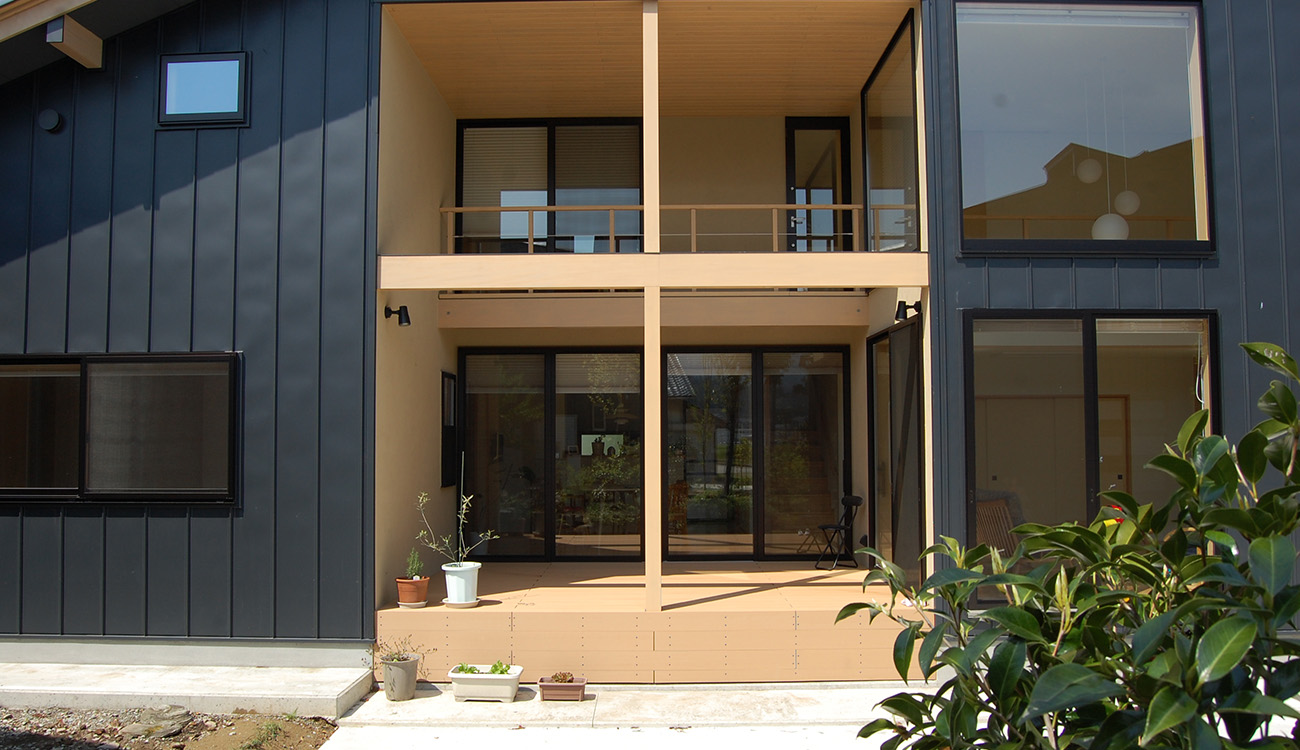 旧宅は築100年以上のワクノウチを持つマエナガレの住宅でした。世代が変わる毎に増改築を繰り返していましたが、暗く・寒く・広すぎということもあり、旧宅を新しく建て替えるという話となりました。 住宅のすぐ東側に息子世帯の離れがあり、そちらに向かって2階分の軒高をもつデッキを設け開くことにより、住棟間の結びつきを持たせ、デッキからの朝日が降りそそぐ明るい住まいとしています。 リビングとダイニングの間にデッキを挟み、食卓とくつろぎの空間を緩やかに接続しています。旧宅のワクノウチの梁を彫刻家の富山省三氏により玄関のベンチと表札に生まれ変わらせて頂きました。