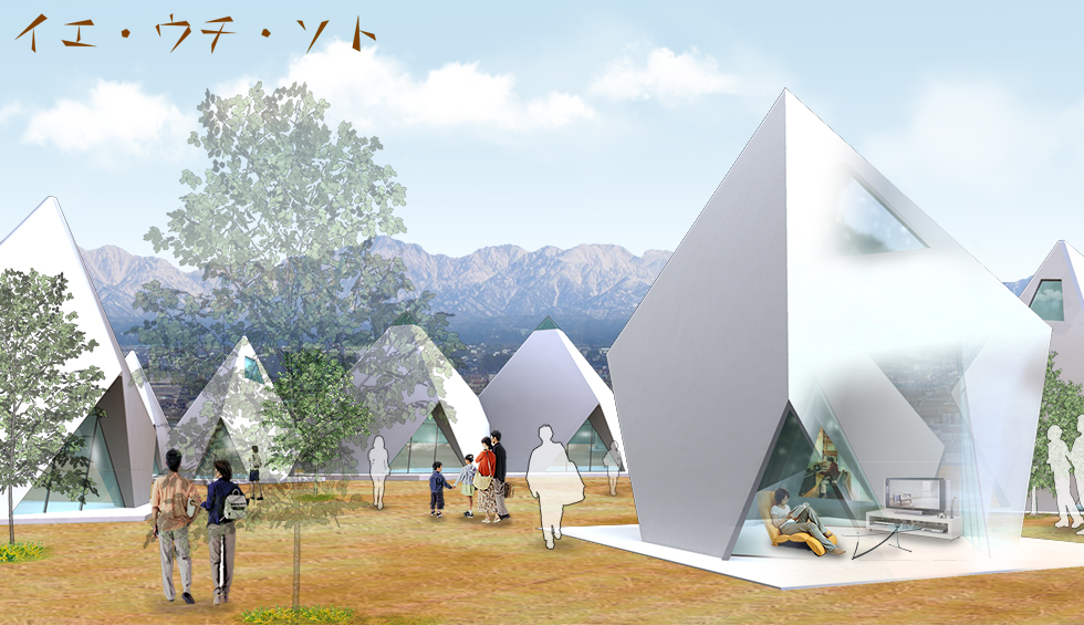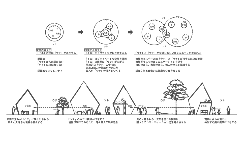 住宅の新しい形の提案。 「イエ」物理的境界、「ウチ」心理的境界、「ソト」それらの境界外。「イエ」の中に「ウチ」がある従来の形から、「イエ」と「ウチ」を逆転させてみる、いわゆる外部空間(庭)を建物の一部ととらえ、建物内と庭そして隣家との関係性を考える。空間の開放と閉鎖の考え方により新たな住宅の形を提案しました。
