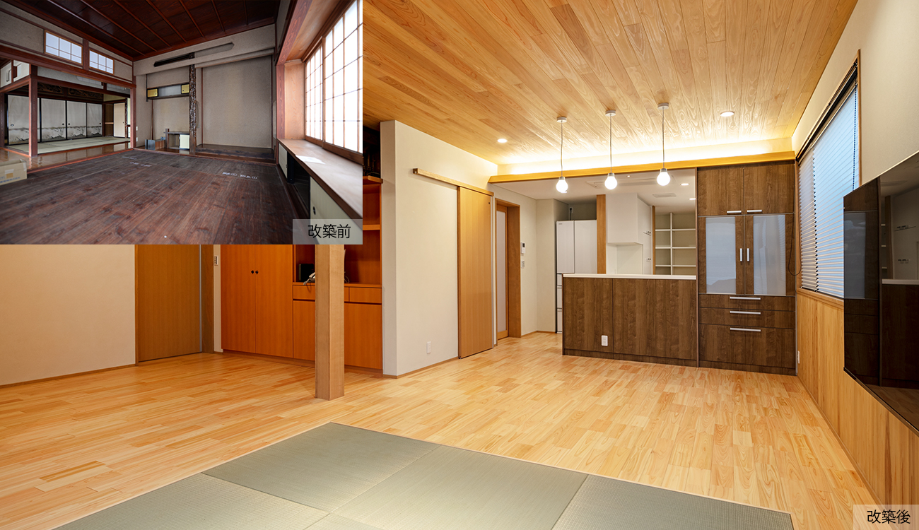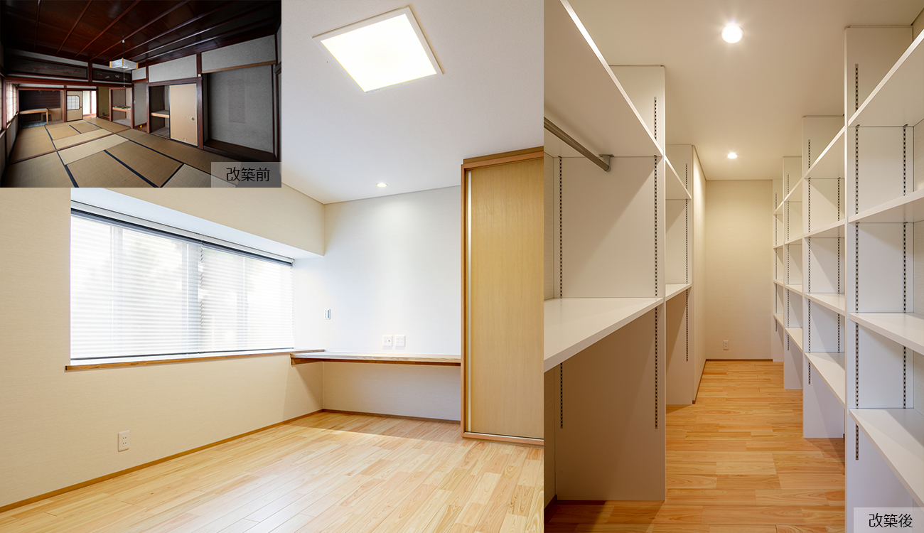娘さん夫婦との同居を考え二世帯住宅として改築を行いました。既設1・2階の和室を構造体を残しつつ、1階には27畳の広いLDKを設け家族団らんのスペースとし、2階は個室のあるプライベートスペースとしてレイアウトを行いました。これまで利用していなかった小屋裏を収納として利用する等機能的な計画としています。