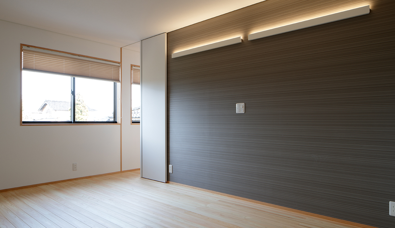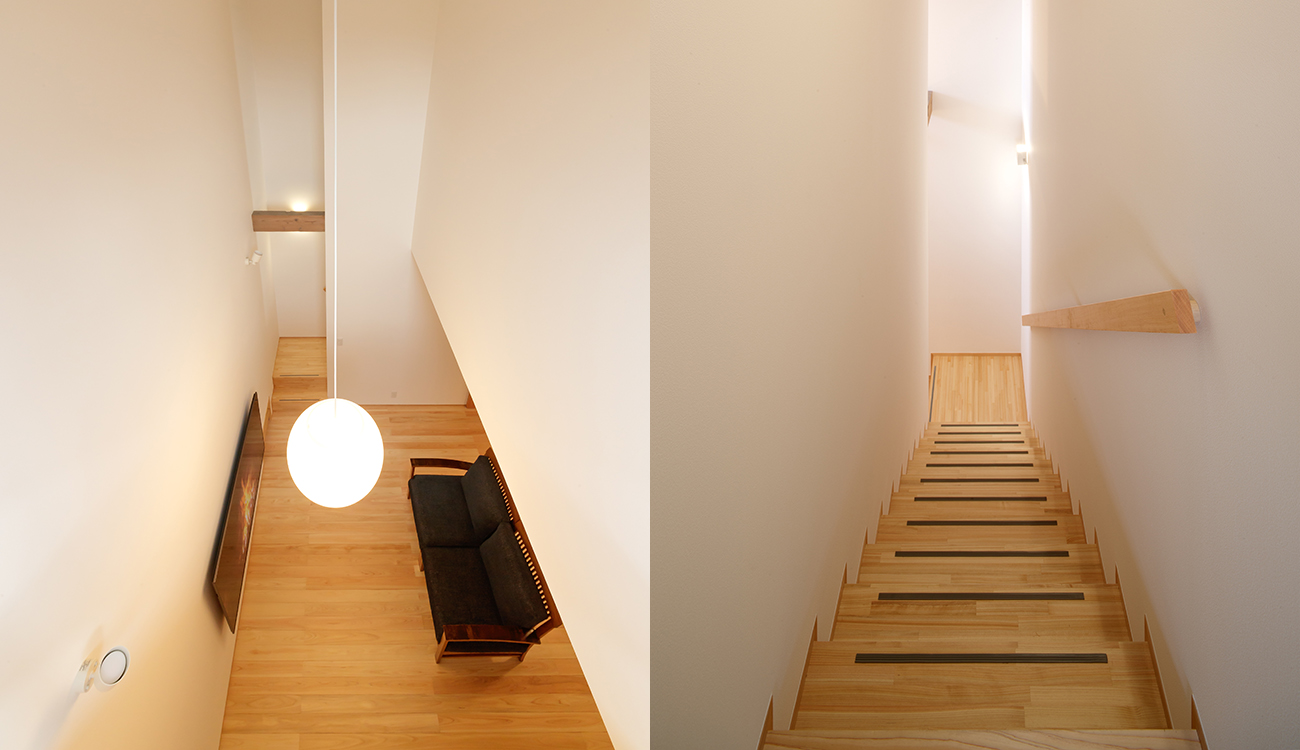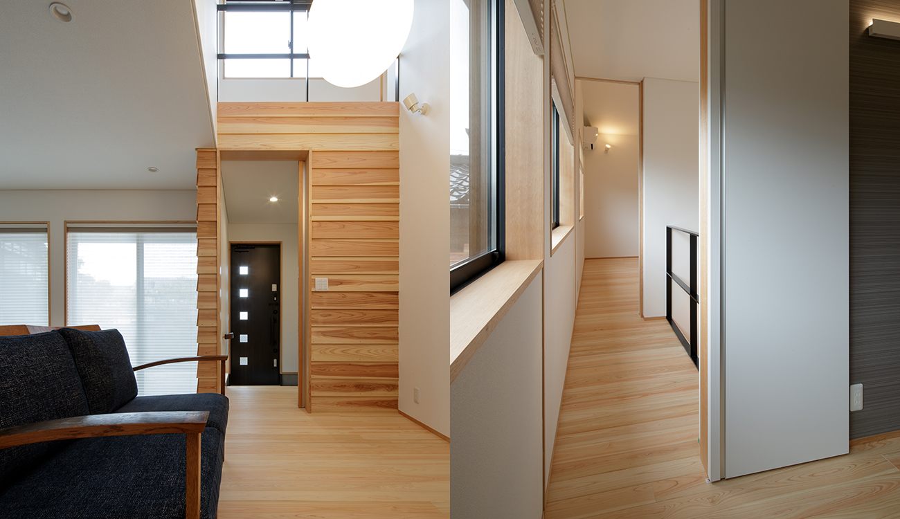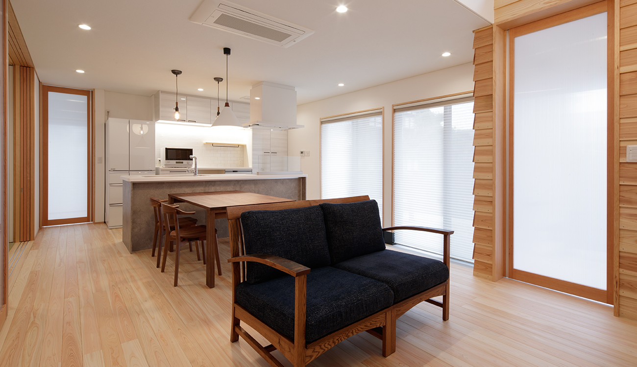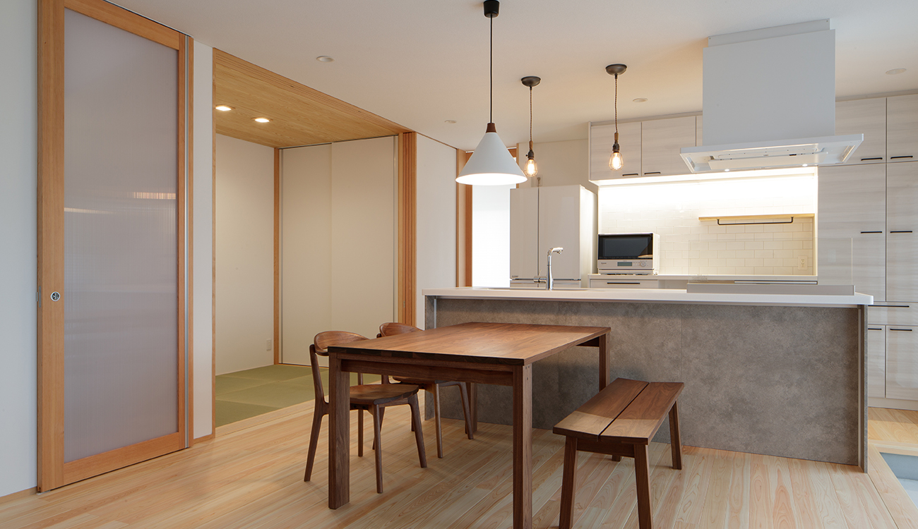 お寺の庫裏部分の改築工事。既設の柱や梁を利用し、新たに若夫婦の住空間を造りました。窓がなく暗かった1階の和室を庭に面して大きく開口部を取り、明るくて広いLDKとしました。キッチン裏には、浴室や洗面・物干場と言った水回りを設け使いやすい生活動線に配慮しています。2階にはリビングに面してキャットウォークを設け回遊性を持たせたレイアウトとしています。