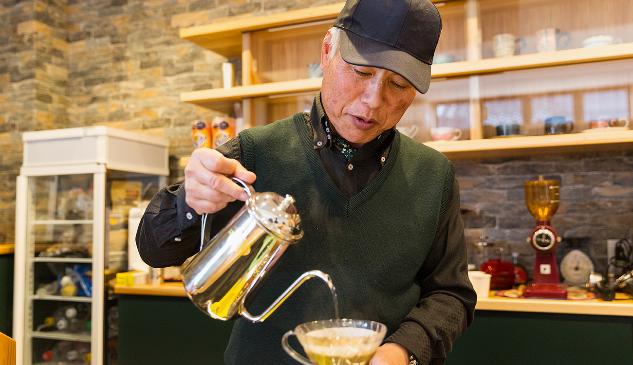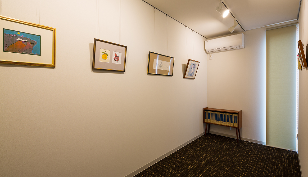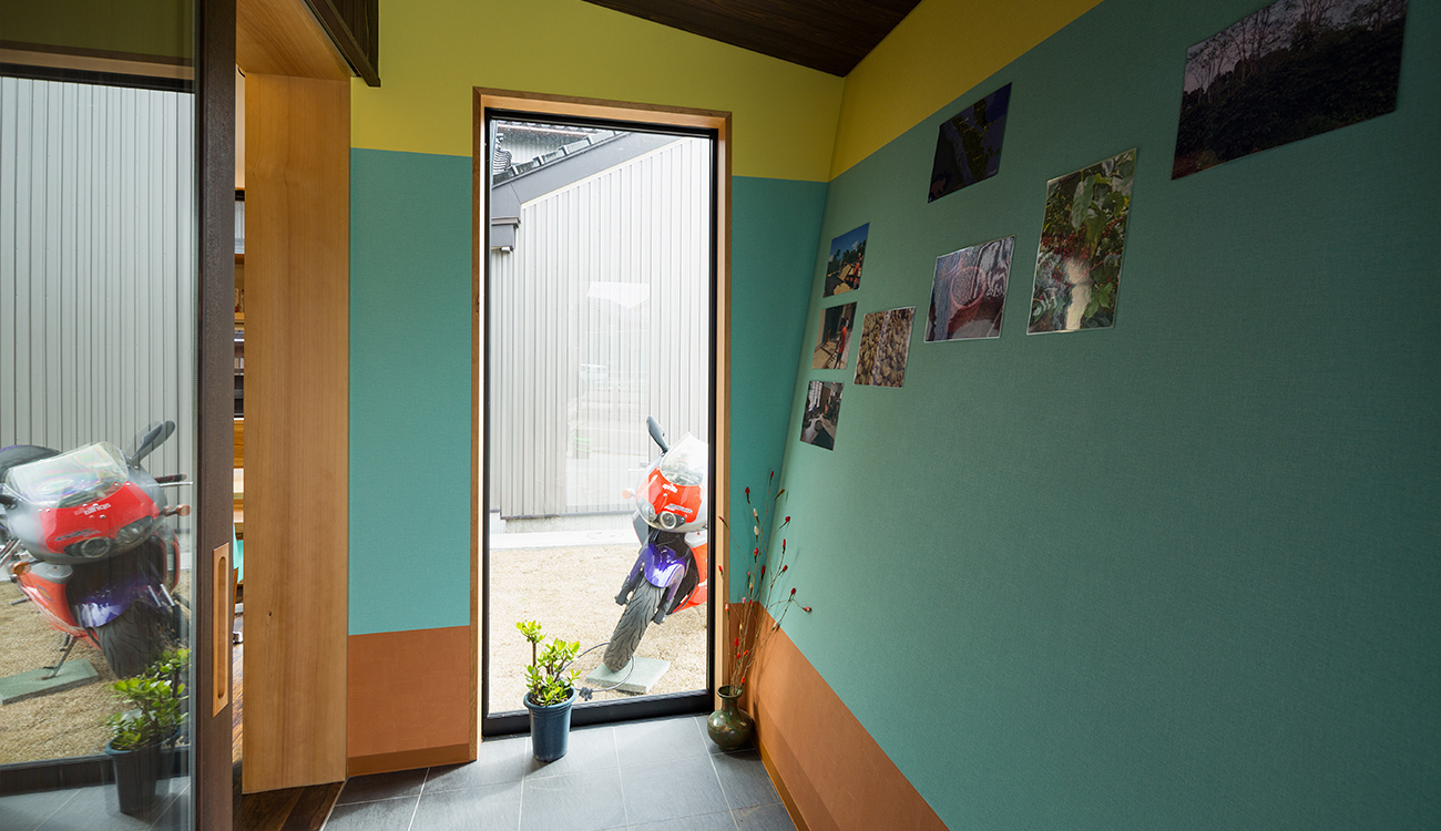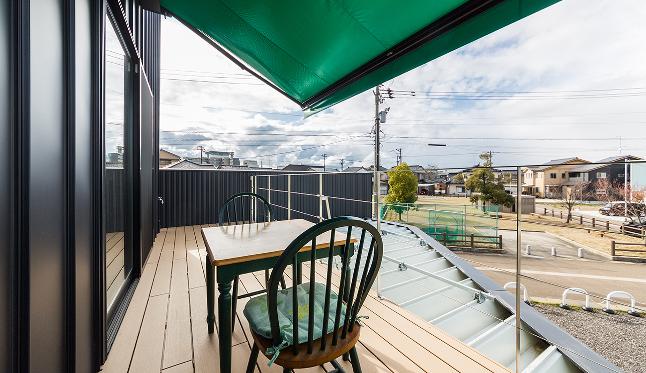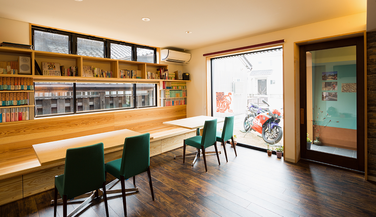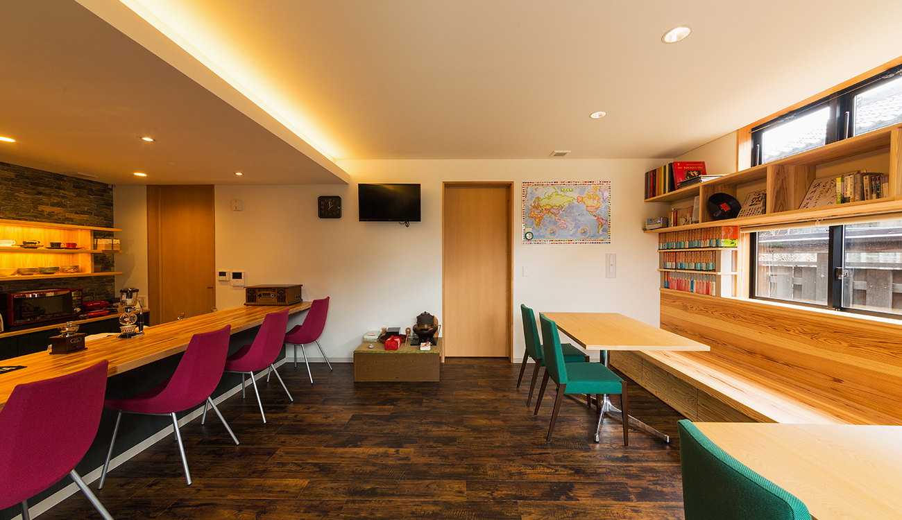 木造2階建ての喫茶店併用住宅。黒いガルバリウムの一見店舗には見えない外観ですが、施主の趣味である車やバイクを展示し、同じ趣味仲間が集まれる場所とした建築です。 店舗には、光棚にコーヒーカップを並べ、カウンター越しにコーヒーを入れる様子を眺められる設えとなっています。 壁にはコーヒー豆の産地が分かるようにピンを止めた世界地図が張ってあったり、アンティークの蓄音機があったり、本が並べてがあったりと、ここにも施主の趣味が表れています。 2階のデッキでは、外の空気を吸いながら、時間を過ごすこともでき、また絵画等のプロジェクトを展示するギャラリーもあり、目でも楽しめる空間となっています。